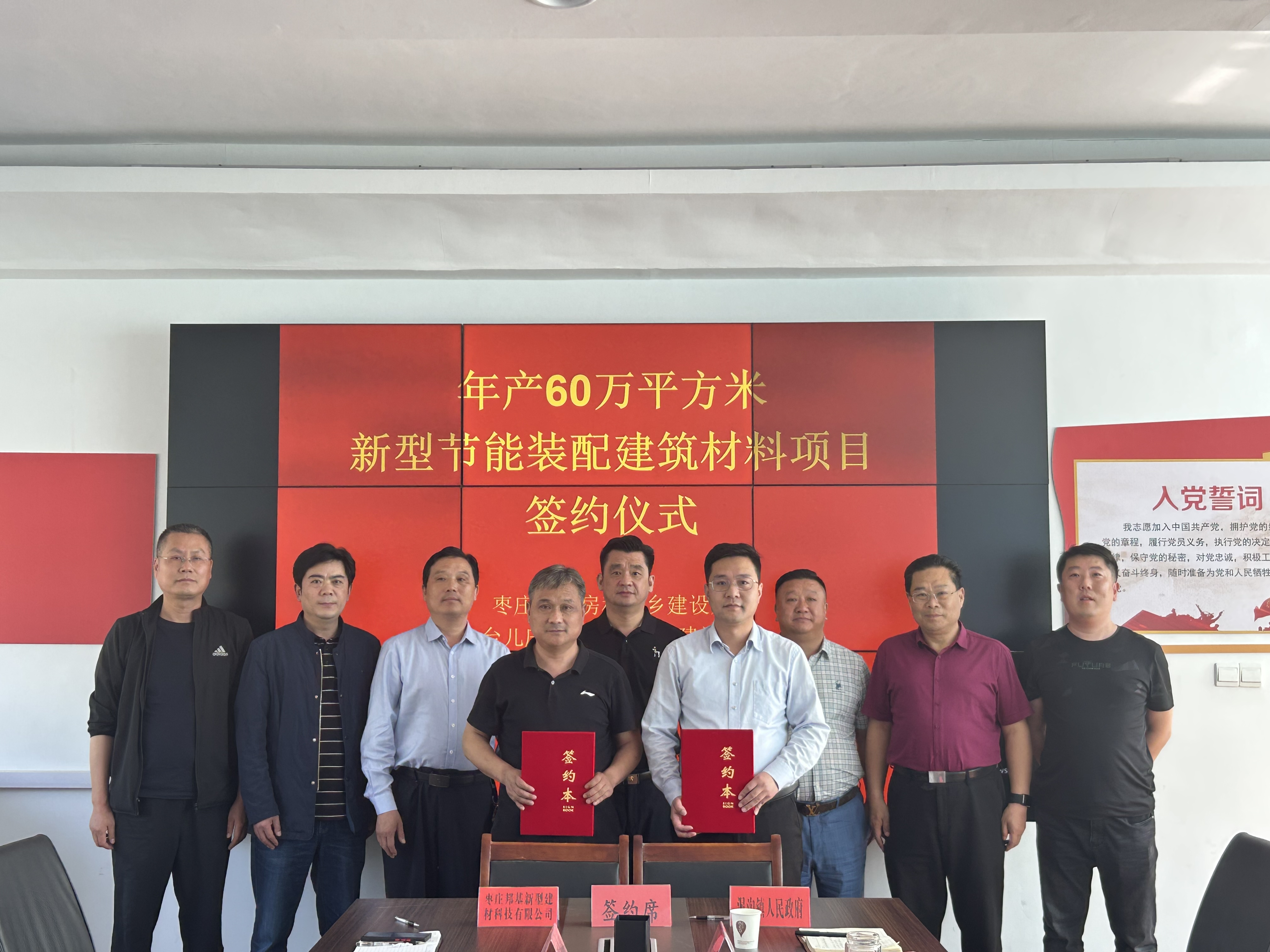 5月8日,市新材料专班(市住建局)推动的台儿庄区新型节能装配式建筑材料项目正式签约,市工程质量安全服务中心主任、市新型建材办主任尹健国,台儿庄区住建局党组书记、局长王勇,台儿庄区住建局一级主任科员徐祥伟、节能办主任孟干,泥沟镇政府副镇长马士勇,项目投资方枣庄市邦基新型建材科技有限公司法人吴寒、项目负责人田源参加了签约仪式。