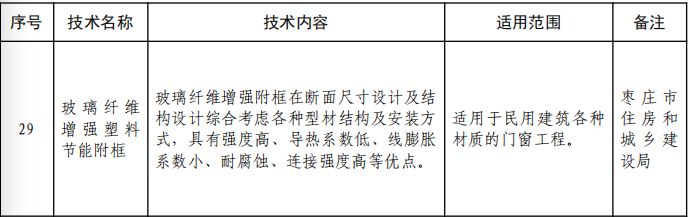 近日,山东省住房和城乡建设厅印发《关于发布〈山东省建筑业推广应用技术公告(2023年度)〉的通知》(鲁建节科字〔2024〕2号),向社会公开发布《山东省建筑业推广应用技术目录及技术简介(2023年度)》,旨在引导鼓励住房城乡建设领域各类主体加大科技创新,赋能新质生产力。我市山东天畅环保科技股份有限公司创新研发的“玻璃纤维增强塑料节能附框”新技术成果成功入选“城乡建设绿色低碳技术”技术目录,对促进全市建筑业技术创新和绿色转型升级起到了良好示范作用。