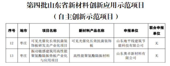 近日,省工业和信息化厅印发《关于公布第四批山东省新材料创新应用示范项目名单的通知》,我市山东地平线建筑节能科技有限公司的可见光催化长效抗菌装饰板研发及产业化项目、山东奥卓新材料有限公司的振动敏感建筑用高性能聚氨酯隔振垫板产业化与应用项目被公布为第四批山东省新材料创新应用示范项目名单(自主创新示范项目),标志着我市建材企业在新材料产业科技创新能力实现新突破。