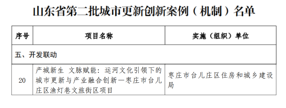 近日,山东省住房和城乡建设厅发布《关于公布第二批城市更新创新案例(机制)经验做法的通知》,我市台儿庄区《产城新生 文脉赋能》渔灯巷文旅街区项目获选。