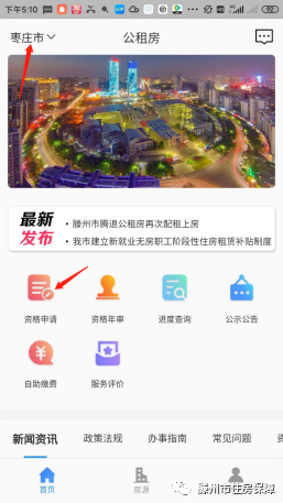 ① 、打开公租房APP,首次运行手机会提示隐私协议、获取存储权限等,请点击“同意”或者“始终允许”,进入首页后,会提示“定位到您在枣庄市,是否切换”请选择“切换”,进入枣庄市操作界面。