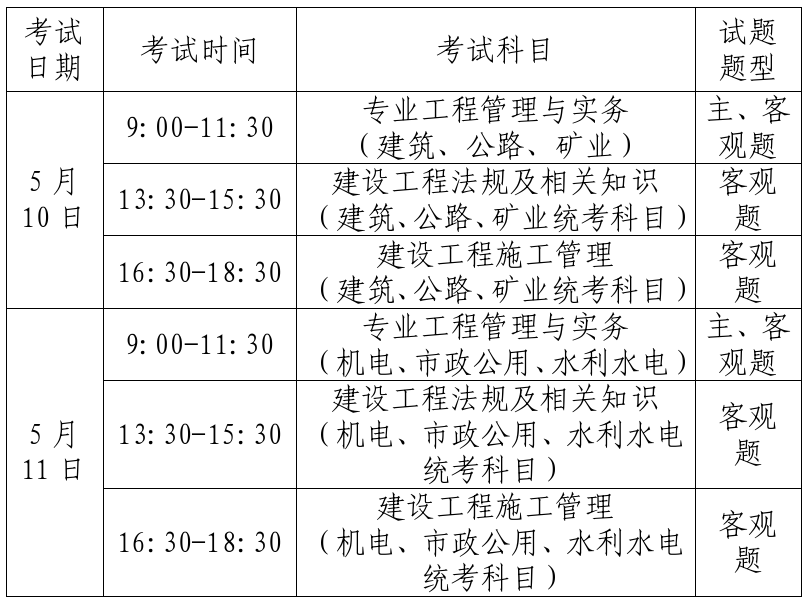 考试按《专业工程管理与实务》科目专业类别分2天2批次实施,具体考试时间、科目和题型见表格。