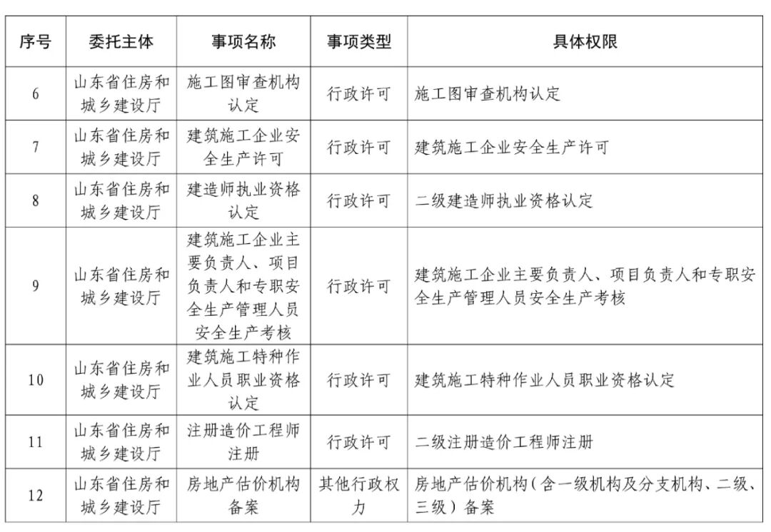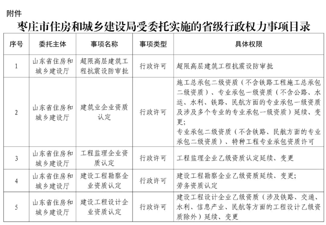 根据《中华人民共和国行政许可法》《中华人民共和国行政处罚法》《山东省行政程序规定》(省政府令第238号)、《山东省人民政府关于部分省级行政权力事项委托实施的决定》(省政府令第368号)等有关法律、法规、规章的规定,枣庄市住房和城乡建设局受山东省住房和城乡建设厅委托,定于2025年12月15日开始实施“超限高层建筑工程抗震设防审批”“建筑业企业资质认定”“工程监理企业资质认定”“建设工程勘察企业资质认定”“建设工程设计企业资质认定”“施工图审查机构认定”“建筑施工企业安全生产许可”“建造师执业资格认定”“建筑施工企业主要负责人、项目负责人和专职安全生产管理人员安全生产考核”“建筑施工特种作业人员职业资格认定”“注册造价工程师注册”“房地产估价机构备案”等12项省级行政权力事项(具体委托情况见附件)。